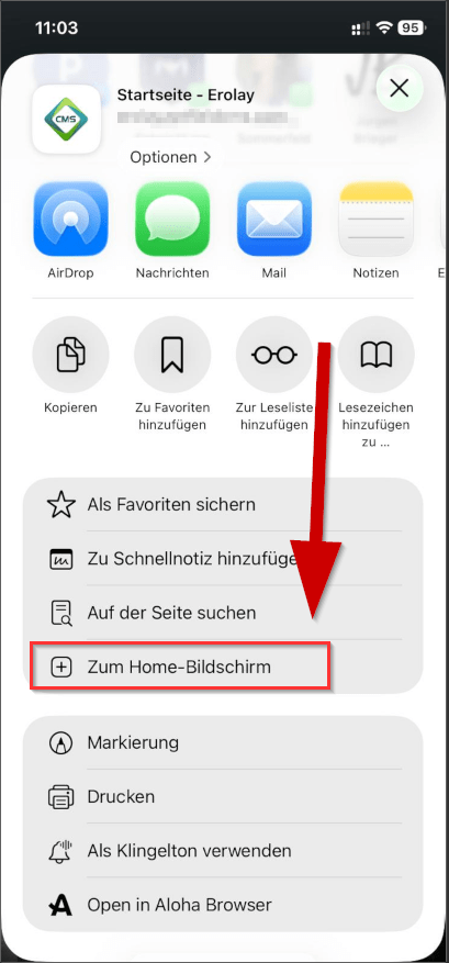 Unten auf das Teilen-Symbol tippen → „Zum Home-Bildschirm“ hinzufügen