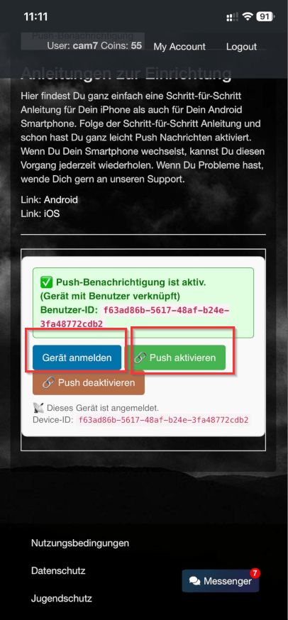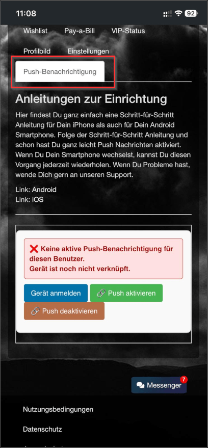 Auf „My Account“ unter Einstellungen: „Push aktivieren“ drücken